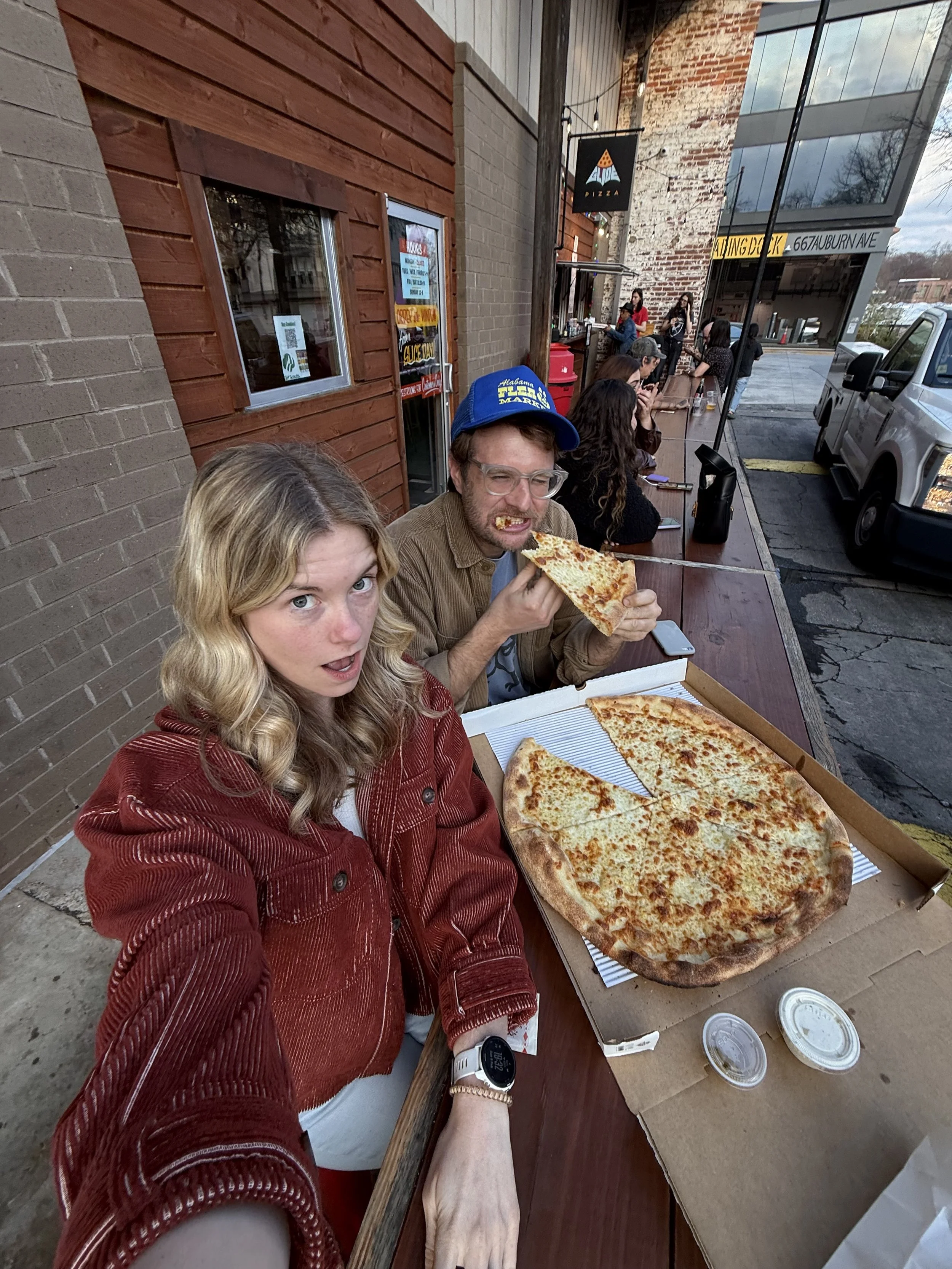 Us eating a huge pizza.